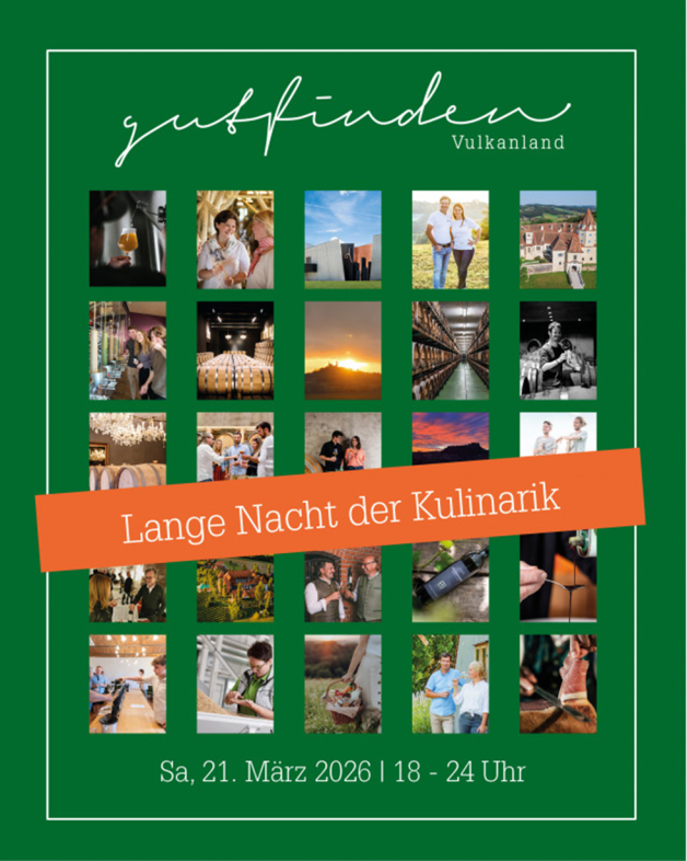 Wir freuen uns auf die nächste “Lange Nacht der Kulinarik”! Genussvoller Höhepunkt in der blühenden Frühlingslandschaft: Erlebnisführungen, Spezial-Verkostungen und ein abwechslungsreiches Rahmenprogramm inkl. Kinderprogramm begeistern Groß und Klein zur “Langen Nacht der Kulinarik” der gutfinden.vulkanland Betriebe. Mit nur einem Ticket öffnen mehr als 20 ganz unterschiedliche Betriebe ihre nächtlichen Tore und zeigen die Vielfalt der regionalen Kulinarik. Weingüter, Genussmanufakturen und Kultur-Einrichtungen laden zur individuellen Rundreise.